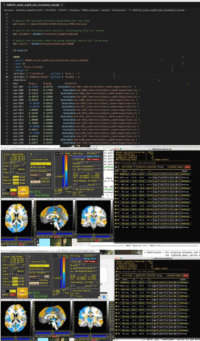 Hello! I am running a 3dMVM to look at the effect of a task bias score on neural activation, and am also attempting to test the quadratic relationship between bias and activation. The raw bias scores range from 0-1, with numbers close to 0 being a strong negativity bias and numbers close to 1 being a strong positivity bias. For the 3dMVM, I 0-centered and then rescaled the bias scores such that they range from -1 (negativity bias) to +1 (positivity bias), where 0 is no bias. I then squared these scores to get the quadratic term. The output of the 3dMVM have exactly the same results for the linear and the quadratic terms, does anyone know why they would be exactly the same? I have attached my 3dMVM set up as well as the outputs.