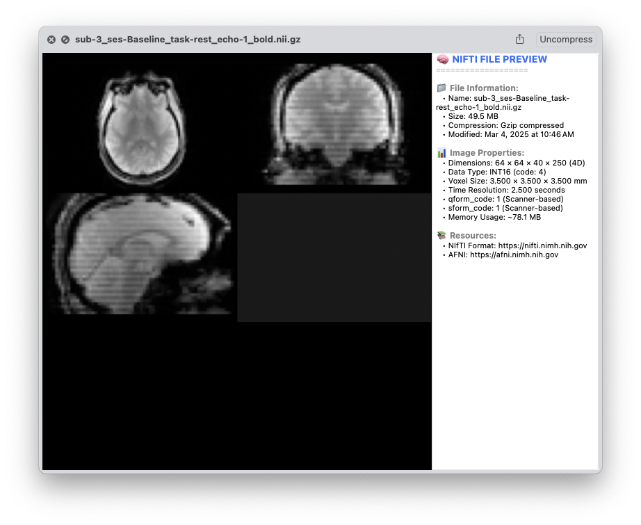 I've put together a Quick Look Preview tool for macOS so you can easily view NIfTI files in the Finder. Select (any?) NIfTI file and press the space bar to get a handy preview like the one below.